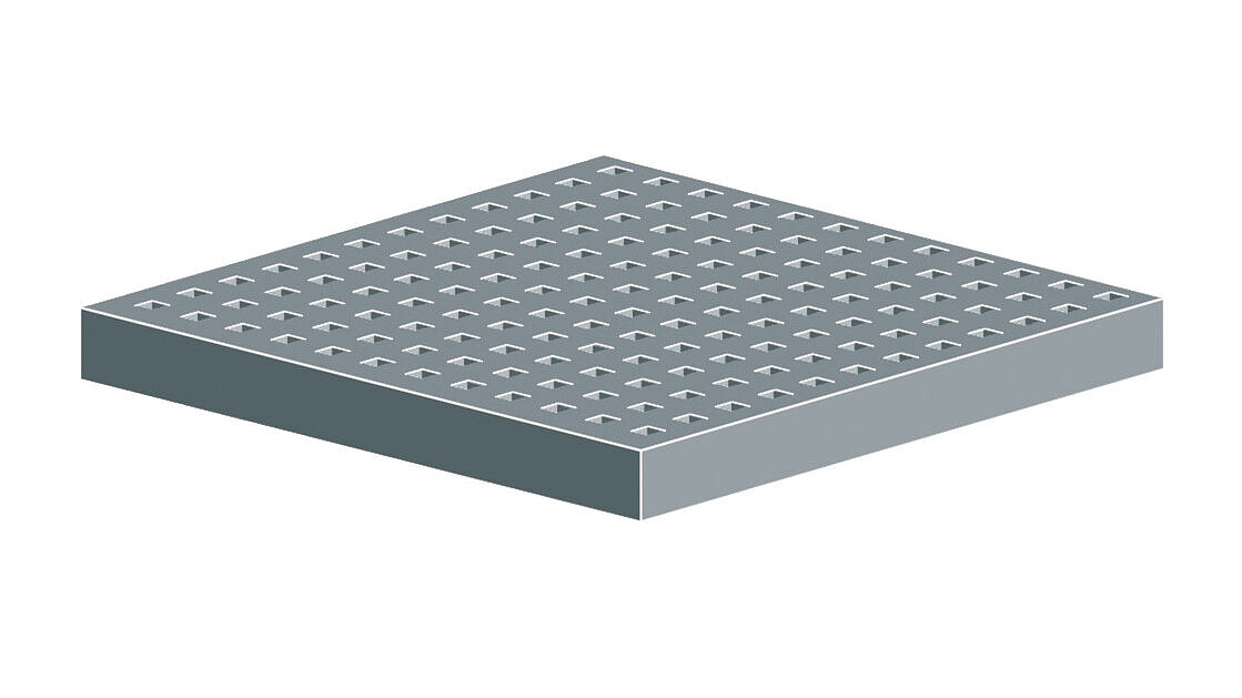 Przeznaczona o strefy chodzenia boso, powierzchnia szczotkowana, antypoślizgowa R 12 (DIN 51130), grupa oceny C (DIN 51097), Ø otworu 8x8 mm, głębokość wkładania 25 mm, grubość 2 mm, klasa K 3