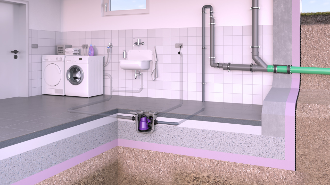 Po zabudowie urządzenia Minilift L w płycie podłogowej powstaje niemal niewidoczna przepompownia wewnętrzna. Wpust zintegrowany z pokrywą zbiera zanieczyszczoną wodę. Nawet w przypadku pęknięcia rury lub powodzi pompa nieustannie odprowadza tę zanieczyszczoną wodę, utrzymując w ten sposób suchość w pomieszczeniach piwnicznych.