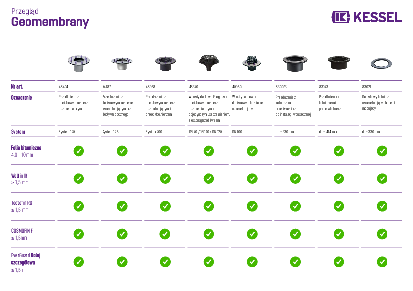 Podczas gdy kołnierze do przyklejenia hydroizolacji nadają się wyłącznie do uszczelniania przeciwwilgociowego, w przypadku kołnierzy dociskowych wszystko zależy od grubość folii i rodzaju maty uszczelniającej: uszczelnienie wodoodporne można uzyskać przy minimalnej grubości folii wynoszącej ok. 1,5 mm. W poniższej tabeli znajduje się zestawienie kołnierzy dociskowych i mat uszczelniających KESSEL, które zostały przetestowane i zatwierdzone do montażu wodoszczelnego. Można również stosować inne uszczelnienia o identycznej konstrukcji i minimalnej grubości folii wynoszącej ok. 1,5 mm. Wykonawca lub producent membrany hydroizolacyjnej musi wykazać, że mata uszczelniająca ma takie same własności.